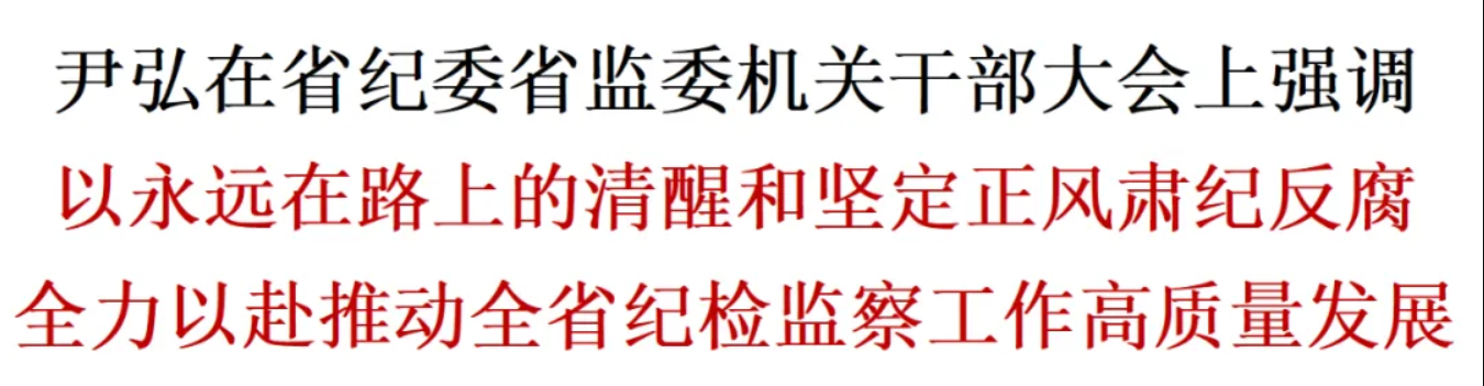 尹弘强调,纪检监察机关作为党内监督和国家监察的专责机关,是推进党的自我革命的重要力量。要旗帜鲜明讲政治,深学笃行习近平总书记关于纪检监察工作的重要指示精神,充分发挥监督保障执行、促进完善发展作用,扎实推进政治监督具体化、精准化、常态化,推动党中央决策部署和省委工作要求落实落地。要以零容忍态度一刻不停惩治腐败,严查权力集中、资金密集、资源富集领域的腐败问题,紧盯“一把手”等关键岗位和重点对象,强化近距离、常态化监督,持续深化以案促改促治,坚决铲除腐败滋生的土壤和条件。要锲而不舍贯彻落实中央八项规定精神,从严从实抓好作风建设,进一步加大明察暗访、监督执纪力度,对违纪行为露头就打、严查快处,坚决防止违规吃喝等歪风反弹回潮,大力纠治形式主义、官僚主义,持续为基层减负,让基层干部心无旁骛抓落实、促发展。要坚决打好群腐集中整治“突击战”,聚焦乡村振兴资金使用监管、养老服务、教辅领域等重点,加压推进整治殡葬领域腐败乱象专项行动,持续攻坚办案,加大问题线索处置力度,形成震慑效应。要打造敢于善于斗争的纪检监察铁军,深入推进“三化”建设年行动,深化纪检监察体制改革,常态化开展纪法教育和培训,提升纪检监察干部政治能力、政策水平、纪法素养,严格依规依纪依法履职尽责,奋力开创新时代全省纪检监察工作新局面。