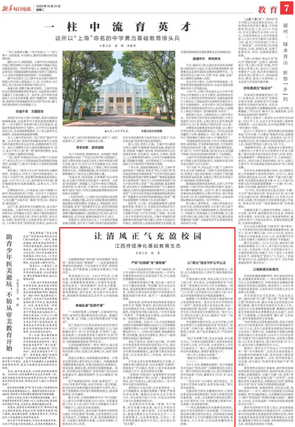 教育是国之大计。2024年以来,江西省委、省纪委监委聚焦群众反映强烈的突出问题,在基础教育领域深入开展专项治理,既坚决查处一批典型案件,形成有力震慑,更注重做实查办案件“后半篇文章”,推动构建免费教辅、透明食堂、阳光招生等长效机制,基础教育领域政治生态和育人环境持续净化。