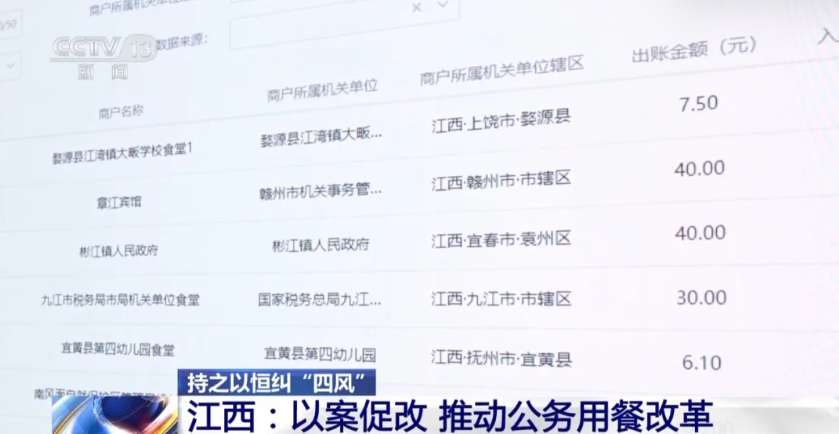 针对类似问题,江西省纪委监委坚持以案促改促治,在全省范围深入排查、梳理分析。推动健全完善省内公务接待统一公函制度,推行到基层公务活动不接受地方工作餐安排。同时在公务接待领域推出“赣餐码”平台,打通省、市、县、乡四级8000多家机关食堂,基本实现全省公务就餐“一码通刷、一网覆盖、一体监管”。省去了公务接待的烦琐流程,而且每笔消费都有迹可查。