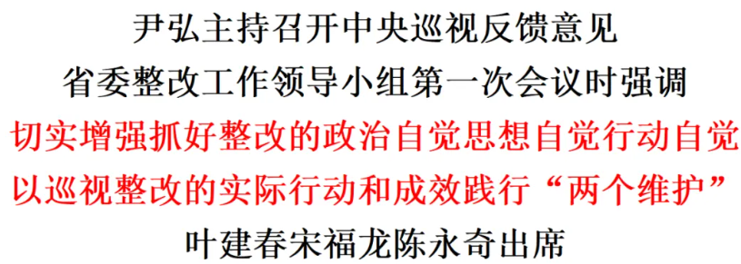 近日,中央第十五巡视组正式向我省反馈了巡视意见。省委常委会连续两次召开会议,传达学习习近平总书记听取二十届中央巡视省(区、市)情况汇报时的重要讲话精神,研究中央巡视反馈意见整改工作,成立了省委整改工作领导小组及其办公室、专项整改组。12月6日,省委书记尹弘主持召开中央巡视反馈意见省委整改工作领导小组第一次会议。他强调,要坚持从政治上看、从政治上抓、从政治上改,进一步统一思想认识,精准对标对表,正视问题差距,切实增强抓好中央巡视反馈意见整改的政治自觉思想自觉行动自觉,扎实做好巡视“后半篇文章”,以巡视整改的实际行动和成效践行“两个维护”。